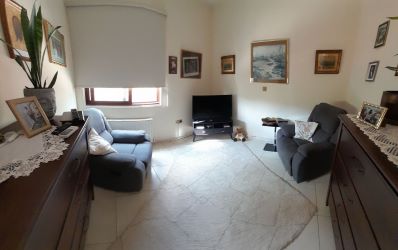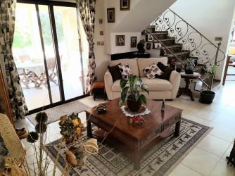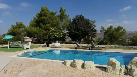 Driving into the property, there are olive and pine trees before reaching the house. Surrounding the house, artificial grass has been professionally laid, and the property also boasts of a large swimming pool.